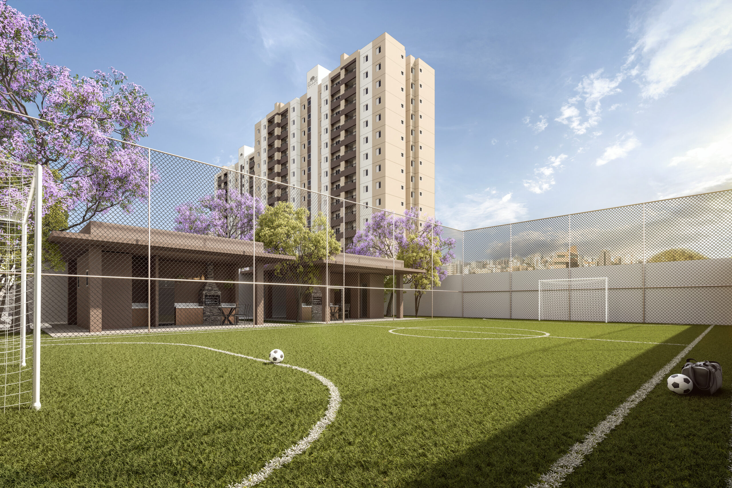 Esportes: Campo de futebol gramado (ou quadra poliesportiva) para os momentos de descontração.